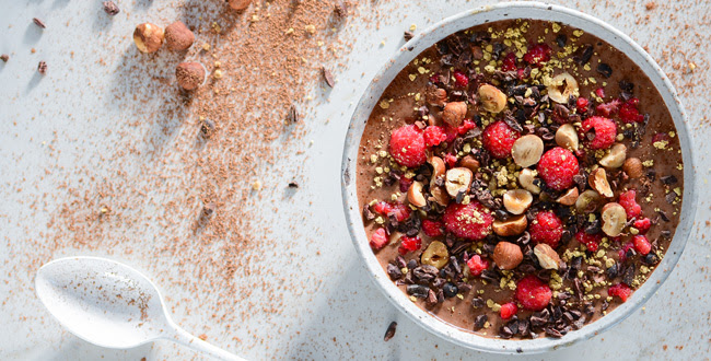 Get the recipe from www.athleta.netCacao and Raspberry Smoothie Bowl